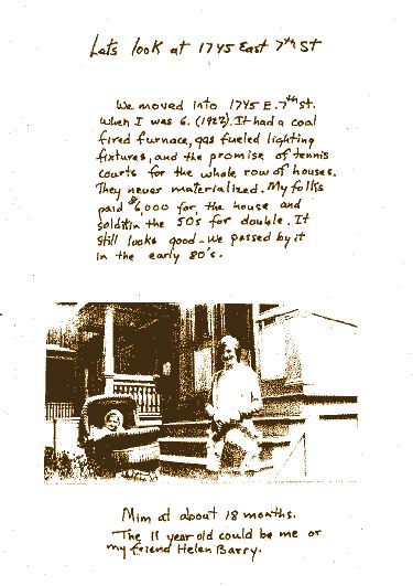 "We moved into 1745 E. 7th Street when I was 6 (1922) It had a coal furnace, gas fueled lighting, and the promise of tennis courts for the whole row of houses. They never materialized. My folks paid $6000 for the house, and it sold in the '50's for double.
