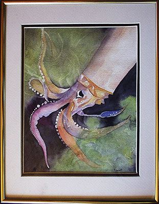 I captured a detail from Mom's squid watercolor which with some luck will show on your monitor the colors, gradations, and paper textures. Naomi has really mastered the watercolor technique.—JDL